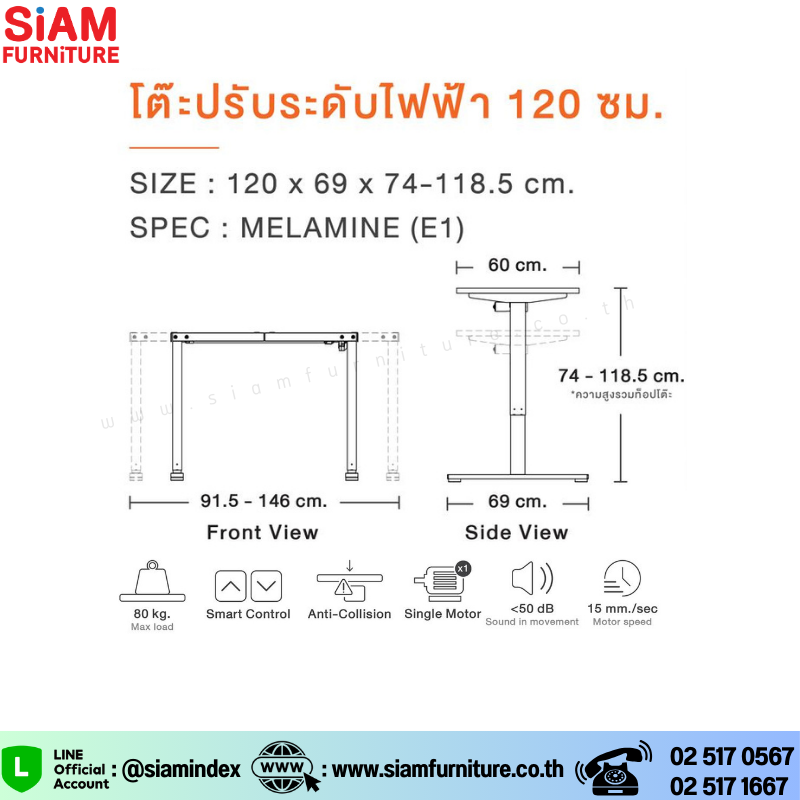 - ขนาด W120 x D60 x H74 – 118.5 cm.