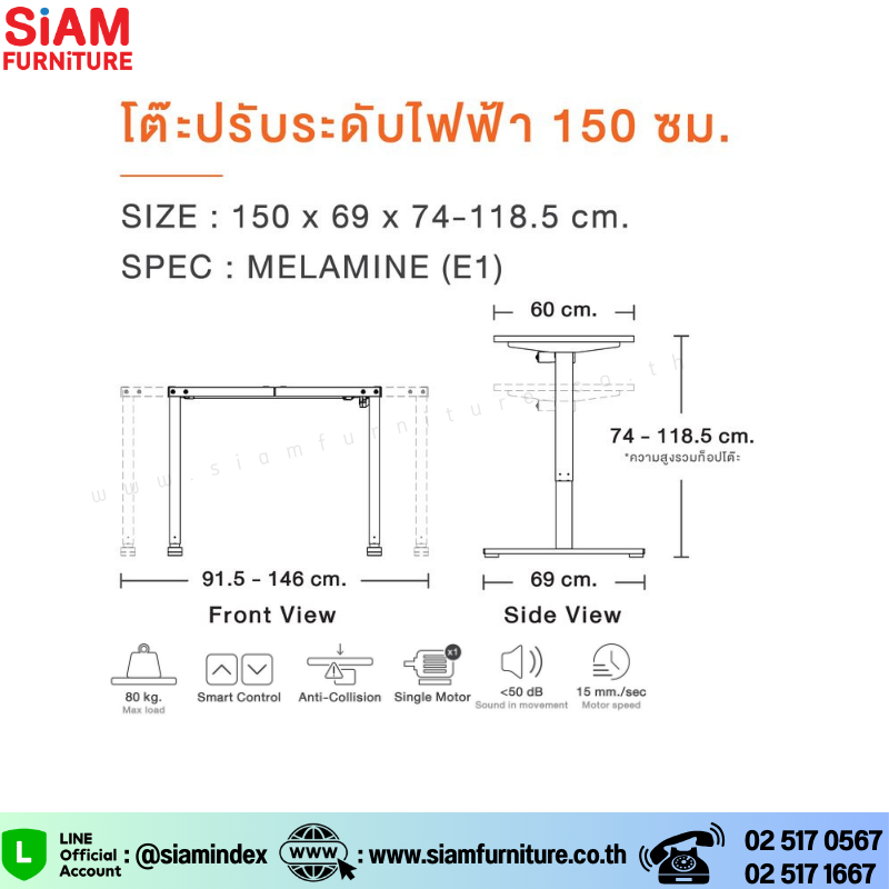 - ขนาด W150 x D60 x H74 – 118.5 cm.